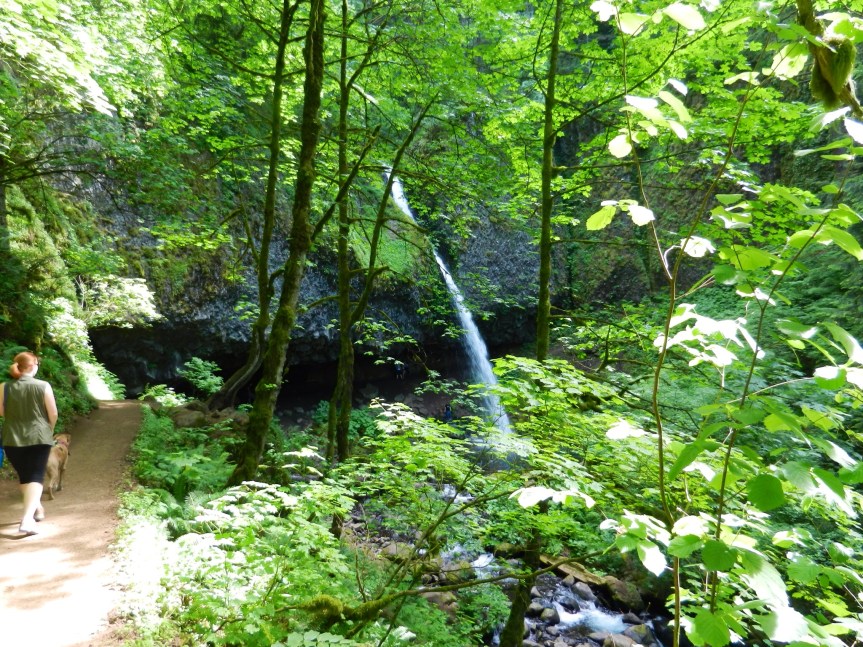 Ainsworth State Park is a small park nestled in the Columbia Gorge, less than an hour outside of Portland. There is a small loop of RV sites and a small loop of tent sites. The sites themselves are also small. We were closer to our neighbors than we have been anywhere else. We were also next to a highway and a train track. The trains didn’t blow their horns but they did come by in the night. I imagine the Parks Department was trying to fit as many sites as they could into the available area, with a mountain to the south and a river to the north, with waterfalls on either side. On the plus side, the park offers full hookup and is surrounded by beautiful trails to giant waterfalls. We are also very close to Hood River, one of our favorite towns in Oregon.
