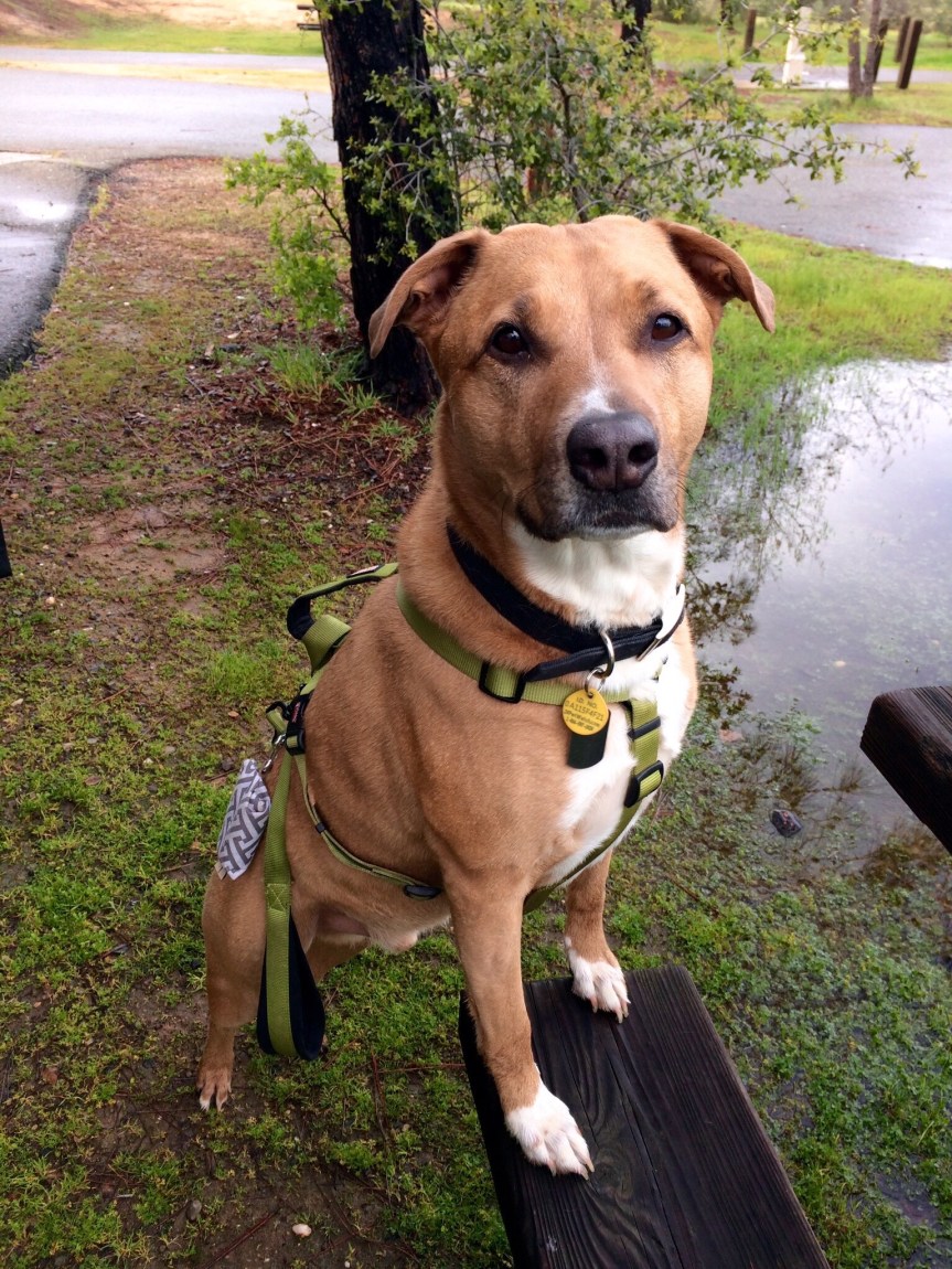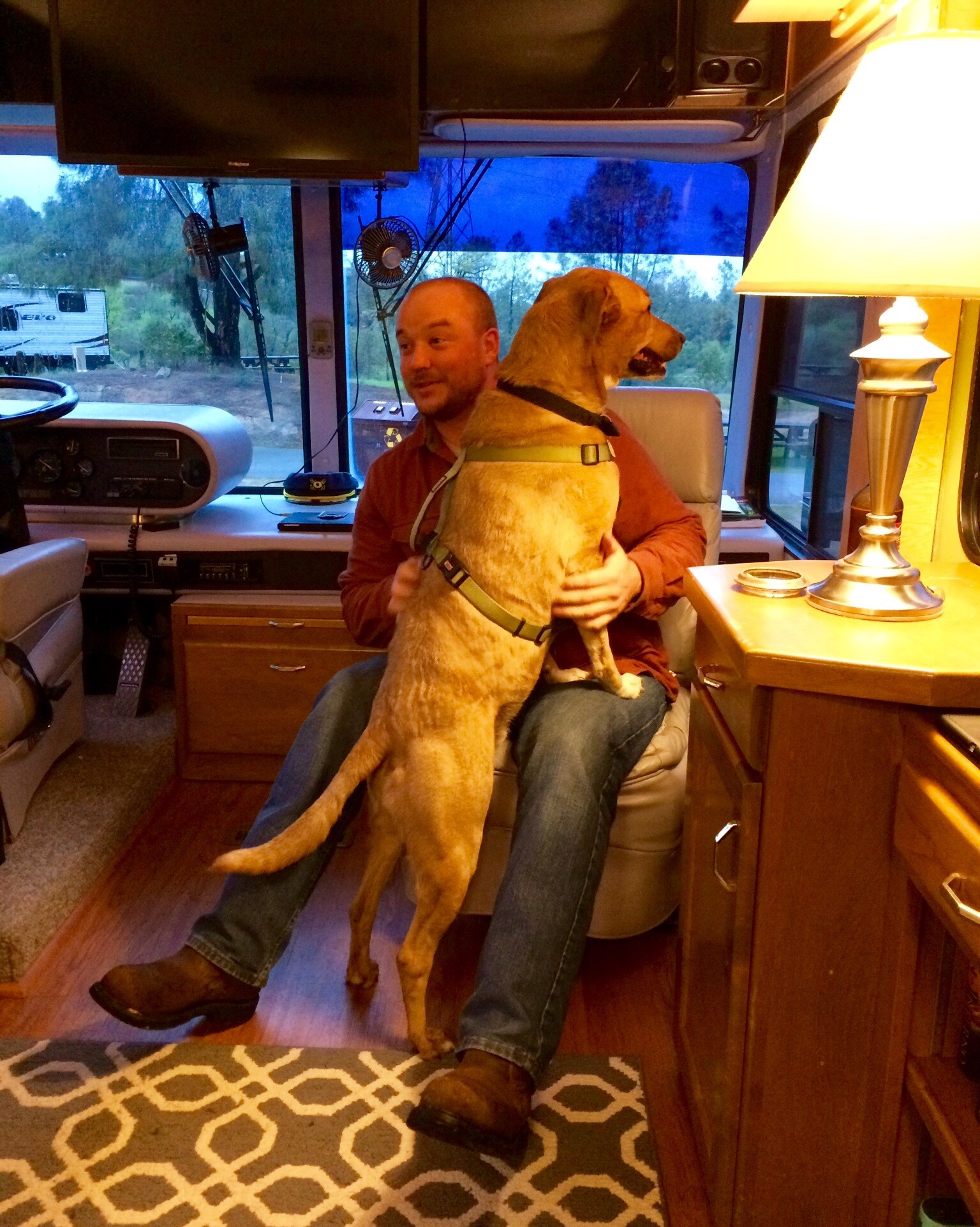 Rudy also had a great time visiting Coleman’s little farm. He hasn’t had space to run free in at least a week. He was also pretty good with the animals. He was very interested in the horses but the horses made sure he didn’t get too close. Unfortunately, Rudy was also really interested in the piles of horse poop that were lying around. Before we could stop him, he was rolling in a big fresh pile, smearing it all over his coat, face, and harness. He smelled like shit the whole way home but he looked so pleased with himself. He got a cold bath with the water hose before we let him back inside the RV. I really should have expected this. Rudy rolled in cow poop just about every time he went to Brandon’s family ranch in La Grange, Texas.