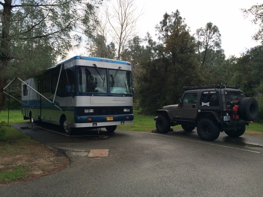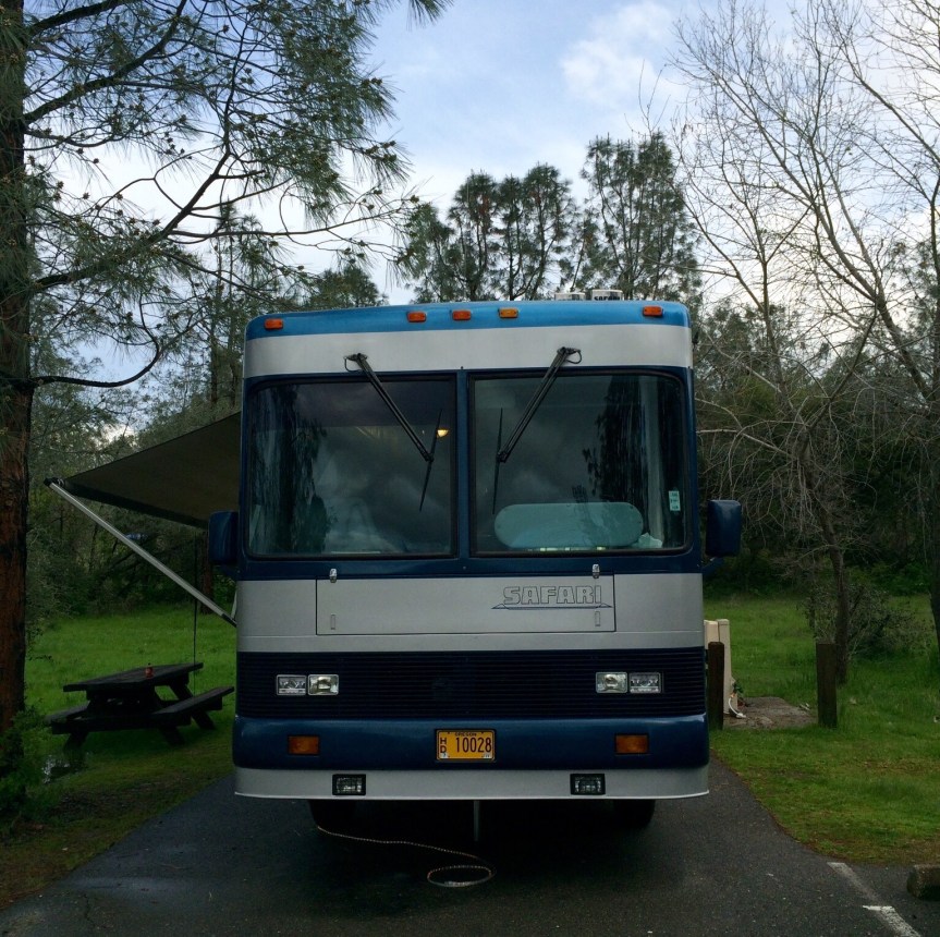 From Ashland we drove five hours south to Sacramento, California. We knew we were in the Bay area when the interstate turned into a seven lane artery of commuter traffic. We were planning to spend the weekend at the Folsom Lake State Recreational Area (SRA). The drive south had been brutal. It rained the entire time and we fought high winds the whole way. The RV acts like a sail in high winds and we get pushed all over the road. Brandon had to drive in the right lane so that we wouldn’t hit anyone if we got pushed by the wind coming over the port bow. The wind also knocked down the LED awning light strip we attached to the side of the RV and the rubber vanity cover that goes around our cabin door. The Weather Channel has been calling all of this rain on the west coast the “Western Deluge”. We had fun with the name for a few days but we are so over it at this point. We’ve spent the last four years dealing with the Pacific Northwest rains and all we want is to dry out and warm up a but. But the rain is just following us south.