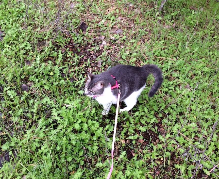 I tried Blossom on the leash first, as she is the more adventurous of the two. After setting up the leash and harness I carried her outside and put her down on a dry patch. To my surprise she immediatly started walking! But not in a straight line. Dogs tend to walk with a purpose, more or less in a single direction. Cats just wander. Blossom also did not seem to understand that she was attached to a leash and I couldn’t follow her under things, like bushes and the RV. But overall, not too bad for our first try. We only went in a small circle around the RV but Blossom didn’t seem to be freaking out.