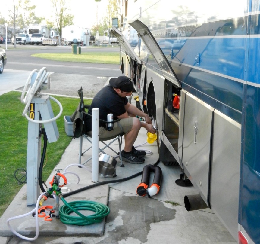 Brandon using his new air pump to check and adjust the pressure in the RV tires. We have a tire pressure monitoring system but since the system is new, Brandon is still monitoring its accuracy the old fashioned way.