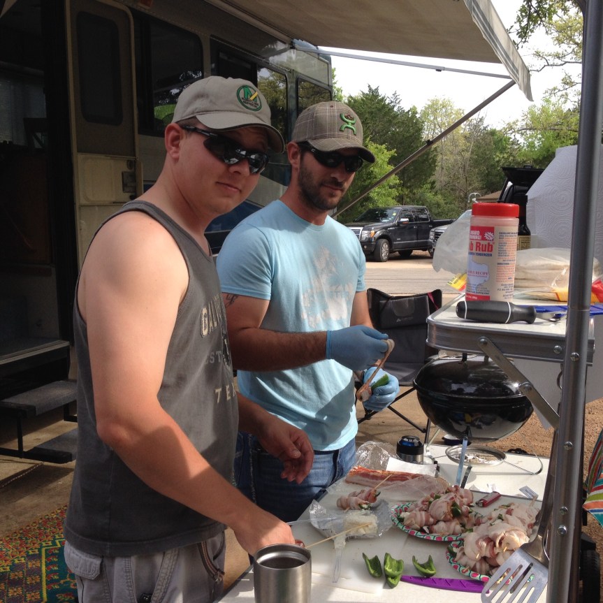 These are two of Brandon’s groomsmen making cream-cheese stuffed bacon-wrapped jalapenos to throw on the grill. Yum!