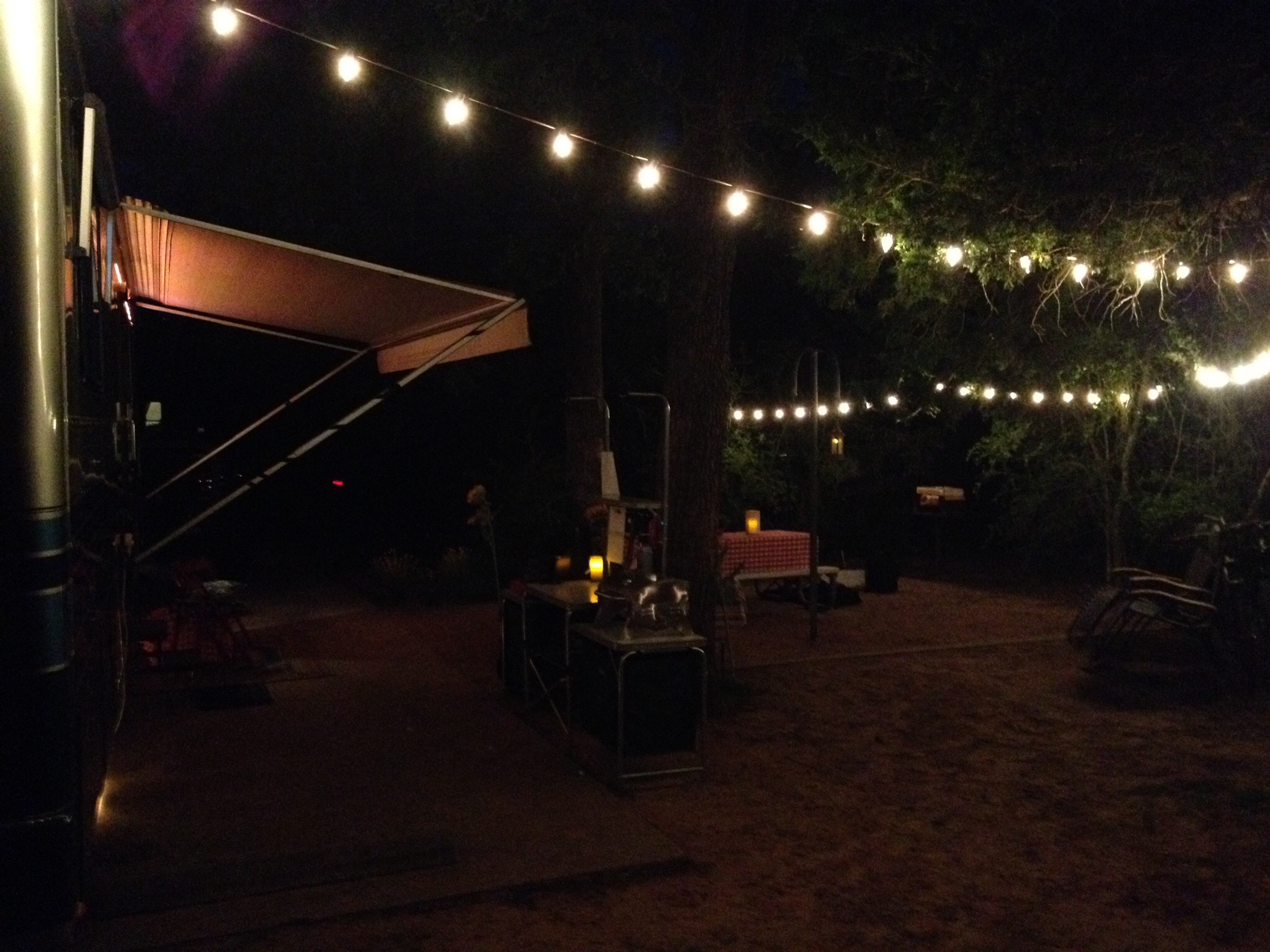 Our site for the next few weeks, complete with patio lighting and our outdoor kitchen set-up.