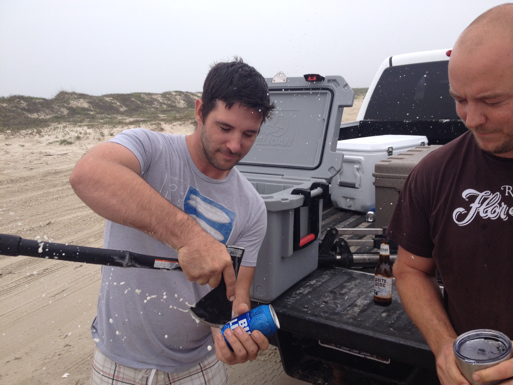 Because everyone knows that the trail axe we keep in the Jeep is really for shotgunning beer!