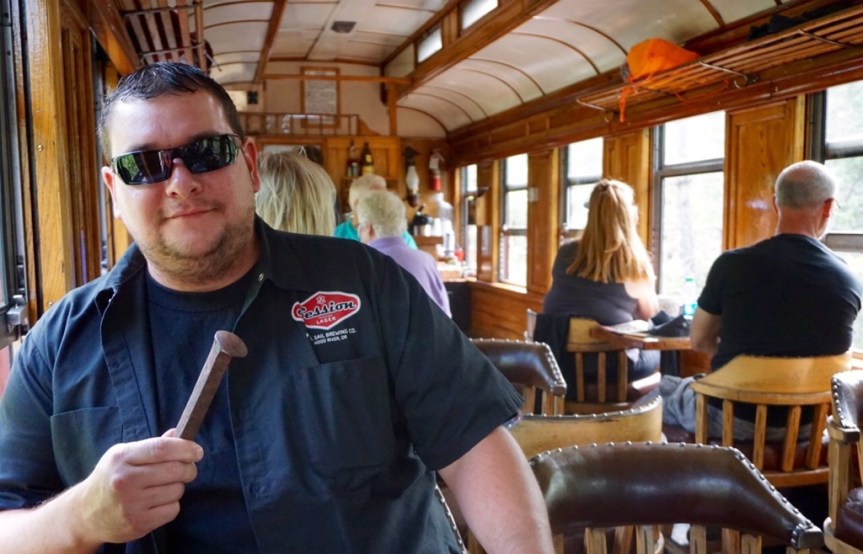 We thoroughly enjoyed our ride in the Alamosa parlor car and think it was worth the money to upgrade. Snacks, non-alcoholic drinks, and a souvenir coffee mug and tote bag were included, but alcoholic drinks were extra. However, the drinks actually weren’t overpriced. We started off our journey with a Rusty Spike (a coffee spiked with Kailua and Bailey’s Irish Cream) and a Bloody Mary. Brandon’s rusty spike even came with an old railroad tie as a stir stick! It was clearly one of our host’s favorite jokes when someone ordered a spiked coffee, “I’m not sure I mixed it well enough. You might need this.”