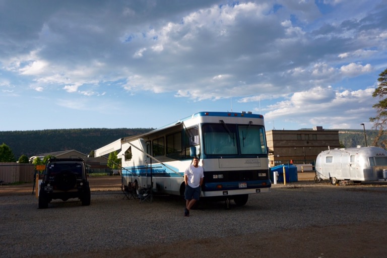 Our spot in Durango is one of my more creative campground finds. We would be staying at the La Plata County Fairground in Downtown Durango. The fairground has six RV spots set up in the livestock trailer parking area. All have water and electric but only spots 1 and 2 have 50 amp service. We were in spot 3 but were able to use the 50 amp service at spot 2 by using a longer extension cord. We would have to move back to our own electrical post if someone showed up to stay in spot 2 but no one ever did.