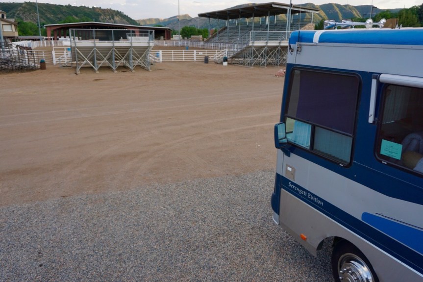 This campground really is an underutilized gem in Durango. All of the spots are covered in gravel, fairly level, and the nightly rodeos are free! At only $16.50 it’s a steal for a campground right in the heart of town. We could take the downtown trolley to Main Street (it stops at the fairground regularly) or drive a very short distance and park. You could also walk or ride your bike down the path along the river. The downsides are the complete lack of shade (this is still a dirt parking lot), the industrial area right behind the campsites (point your lawn chair the other way and you’ll never notice it), and if you’re looking for some peace and quite, the nightly rodeos might be a problem.