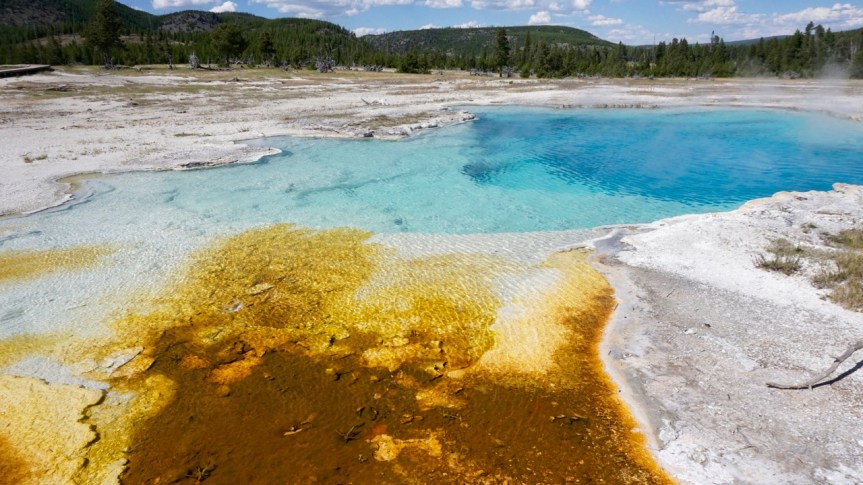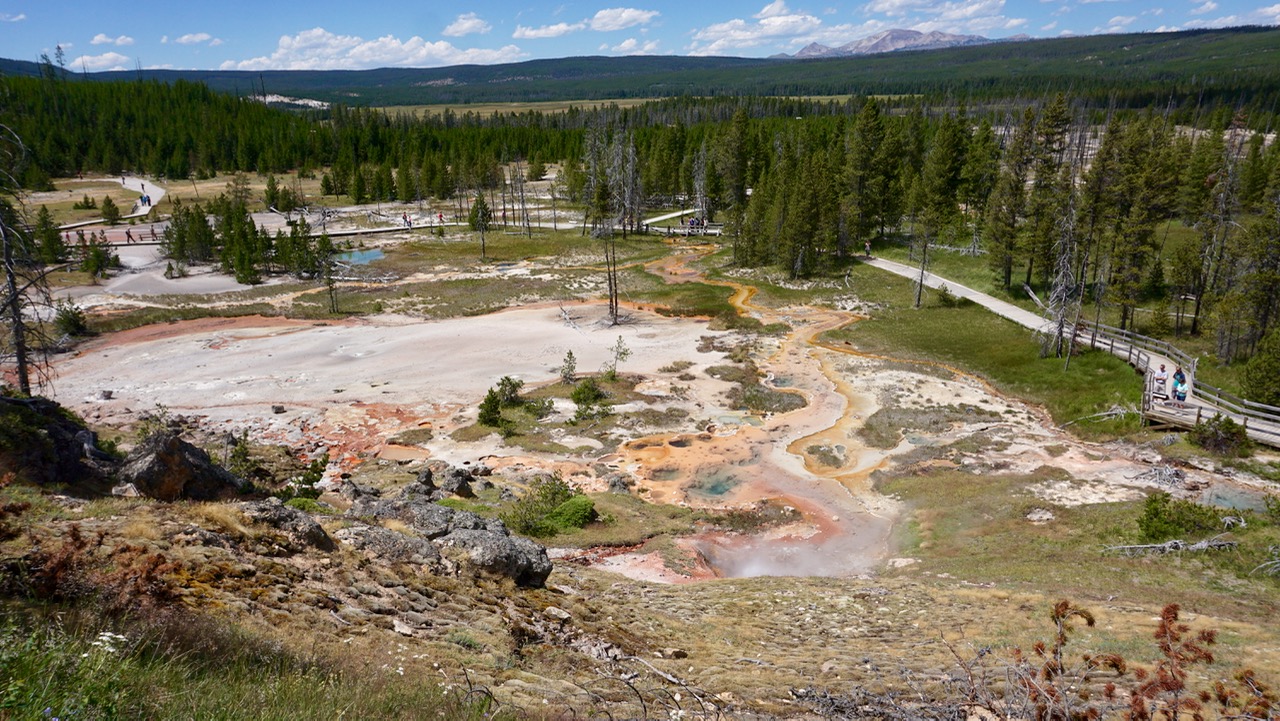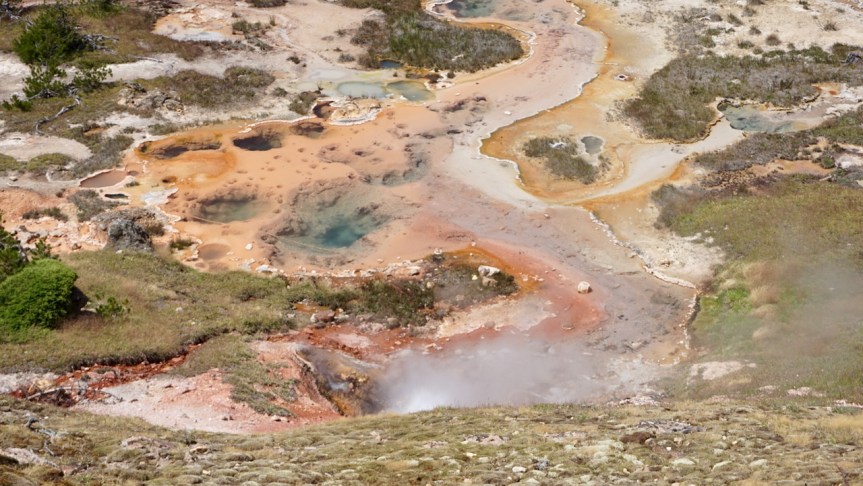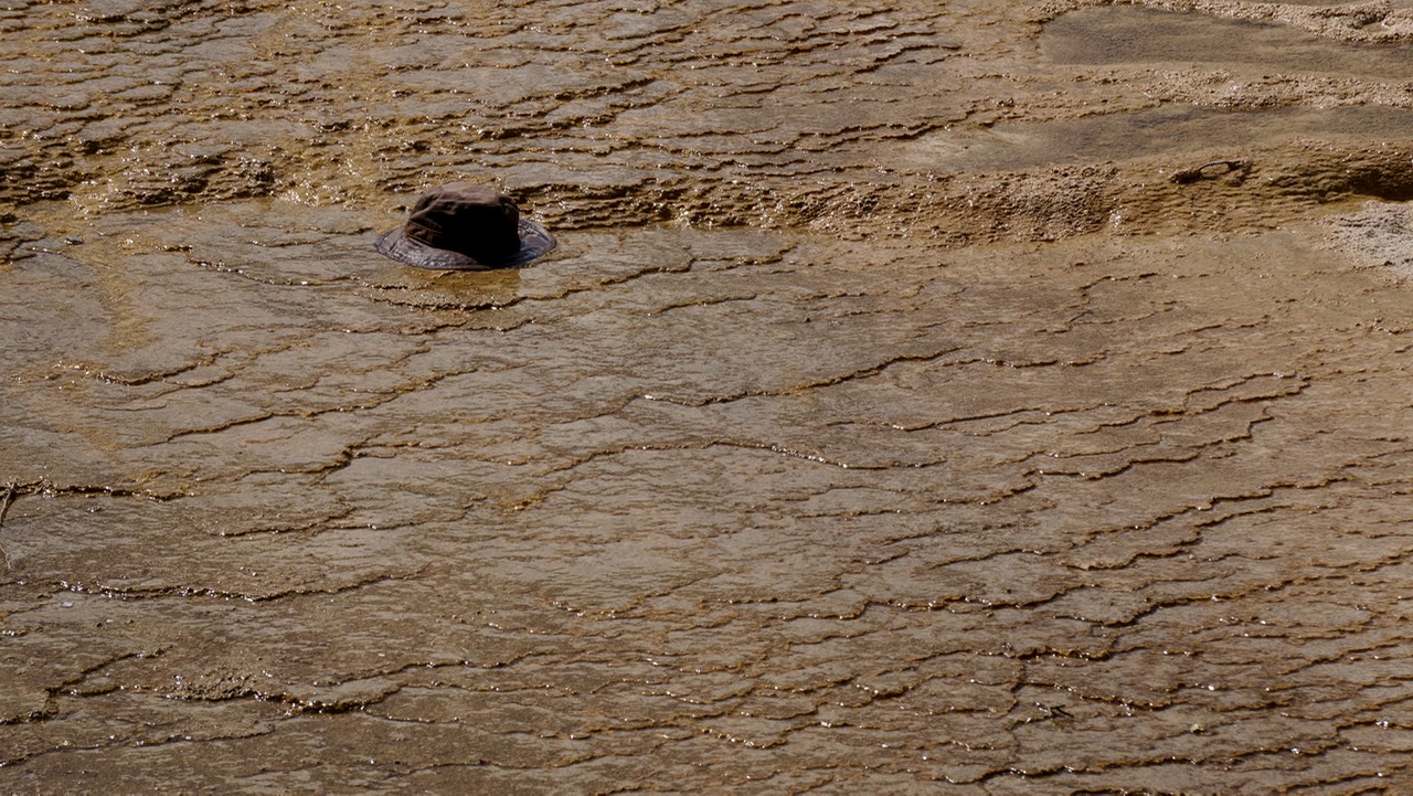 More lost hats, but these were particularly festive lost hats. The problem with losing your hat at Yellowstone is that it is strictly forbidden to leave the boardwalk when viewing the thermal activity. The area is very delicate and stepping off the boardwalk could damage the land or cause injury. The crust is very thin in parts and you could step on a weak spot and end up in hot water, quite literally. So when your hat blows off you just have to let it go. I imagine a park ranger comes by regularly with some sort of extendable grabber arm and retrieves all of the lost hats.