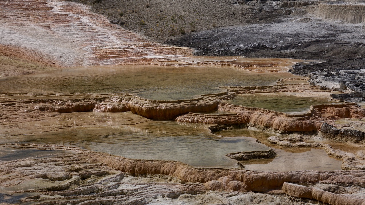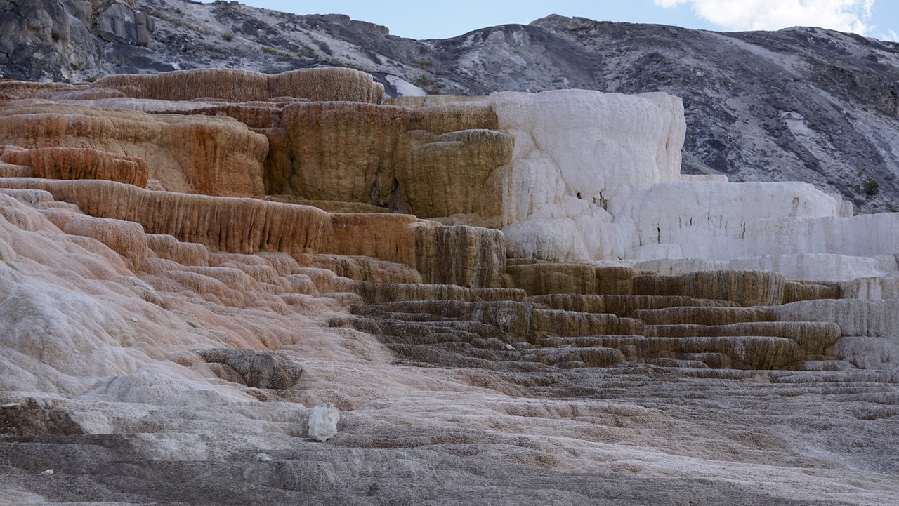 We continued north from Norris around the west side of the park in a clock-wise direction. Our next big stop was at the Mammoth Hot Springs Terraces, just south of the tiny park community of Mammoth Hot Springs. I really wasn’t sure what to expect out of the terraces. It wasn’t a geyser and it wasn’t pools like the paint pots, but I had read that it was a must-see. And it really was. The water cascading over the rocks, and changing from white to orange was beautiful. We tried, but this really is the kind of place where pictures are never fully adequate and descriptions fall short. It’s like an alien landscape.
