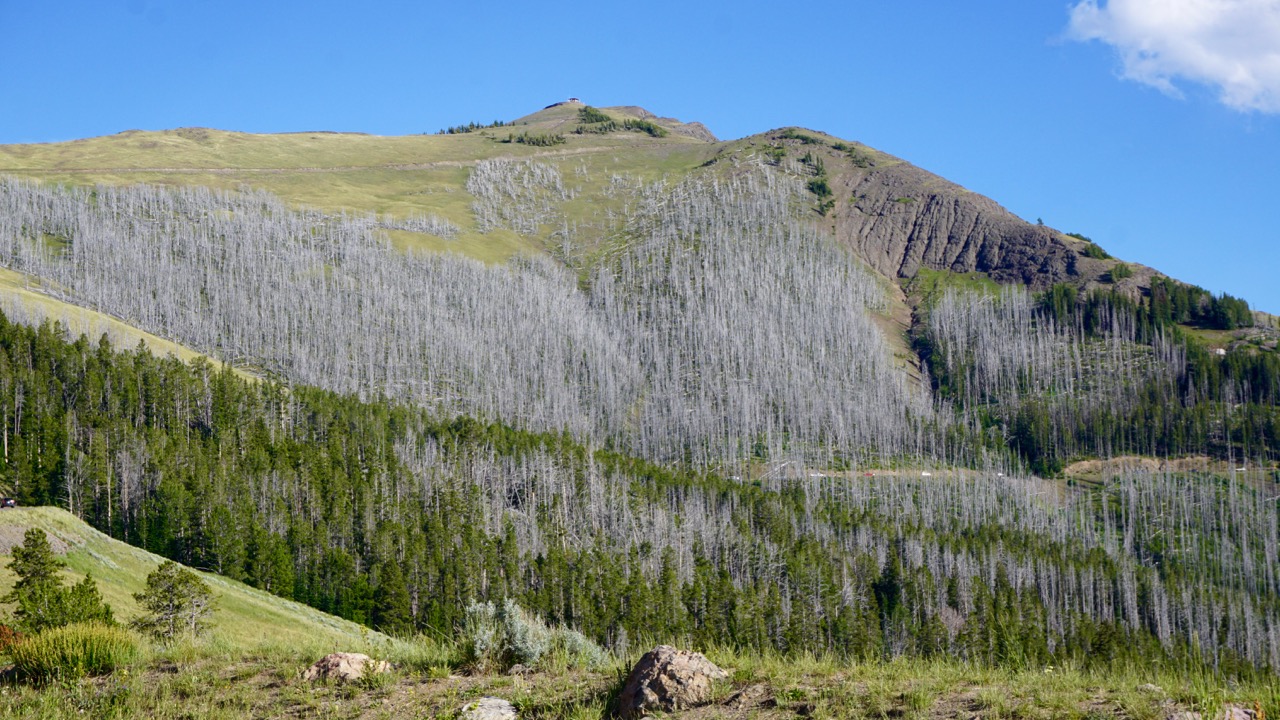 Something we have seen consistently during our national park tours is dead forest and regrowth. Some of the trees are killed by the lodge pine beetle (as in Rocky Mountain National Park) and some were killed by forest fires (common in Yellowstone and Glacier). I believe these trees were killed by fire. The baby trees you see are naturally reseeded, all part of the natural life cycle of the forest.