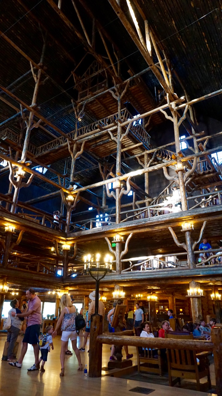 The entire lodge is build from logs, most hand-cut. The crows nest you see at the very top of the photo below is no longer accessible except by special tour (we asked, one tour a week and they fill a year in advance). The lodge has to limit use of the upper floors because an earthquake weakened the support beams and they prefer to limit usage rather than replacing the original beams. The lower three levels are accessible at any time.