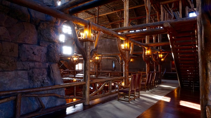 Stop two was the Old Faithful Lodge. We had heard that the restaurant is not as crowded at lunch time and that they don’t take reservations. However, on the way to the lodge we got stuck in the construction traffic we had heard about and the restaurant was closed for lunch by the time we arrived. We settled on bison burgers and hot wings in the bar again. The hot wings were actually really good but we had our hopes up to eat in the historic dining room.