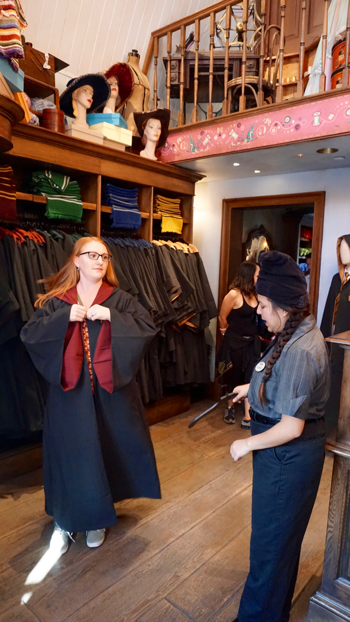 First stop for this witch was Gladrags Wizard Wear. I needed to get into character and that meant buying a set of wizard robes to go over my muggle clothing. As a Gryffindor, I picked a set with a red lining to match our house colors of red and gold. The sorting hat had wanted to sort me into Ravenclaw (which makes sense given my proclivity toward academics), but knowing that the hat also takes your choice into account, I asked to be in Gryffindor instead.