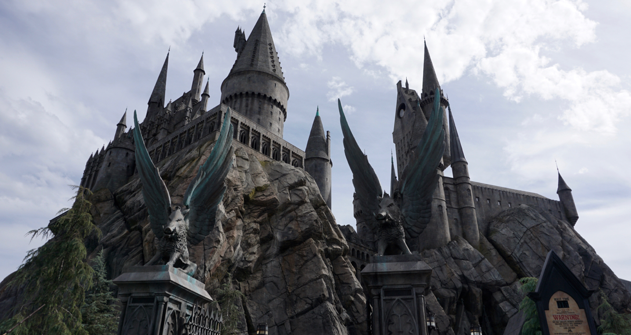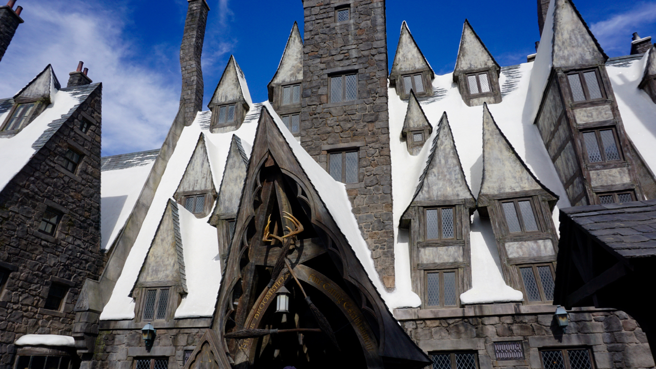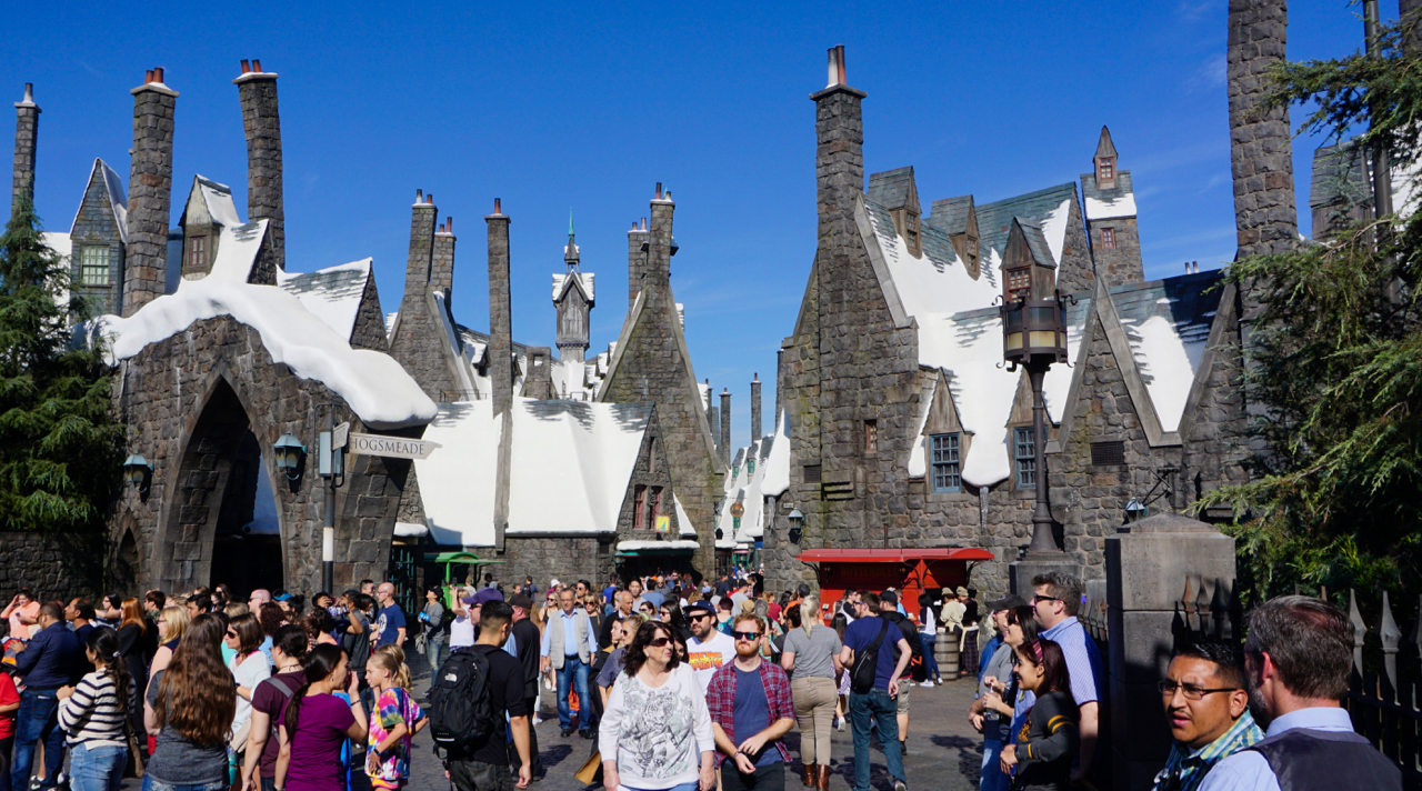 The Harry Potter theme parks are designed to mimic particular places from the books. The park in Florida is Diagon Alley, the secret wizard shopping district in London, and the park here in L.A. is the village of Hogsmeade, a small town near Hogwarts school that the students get to visit a few times a year as a treat. The parks do an excellent job of keeping things authentic to the Harry Potter universe by including the businesses that would actually be found in that area. For example, in Hogsmeade you will find Honeydukes candy shop and the Hogshead Pub, just like in the books. And in Diagon Alley you will find Gringotts Wizard Bank and the Leaky Cauldron pub, just like in the books.
