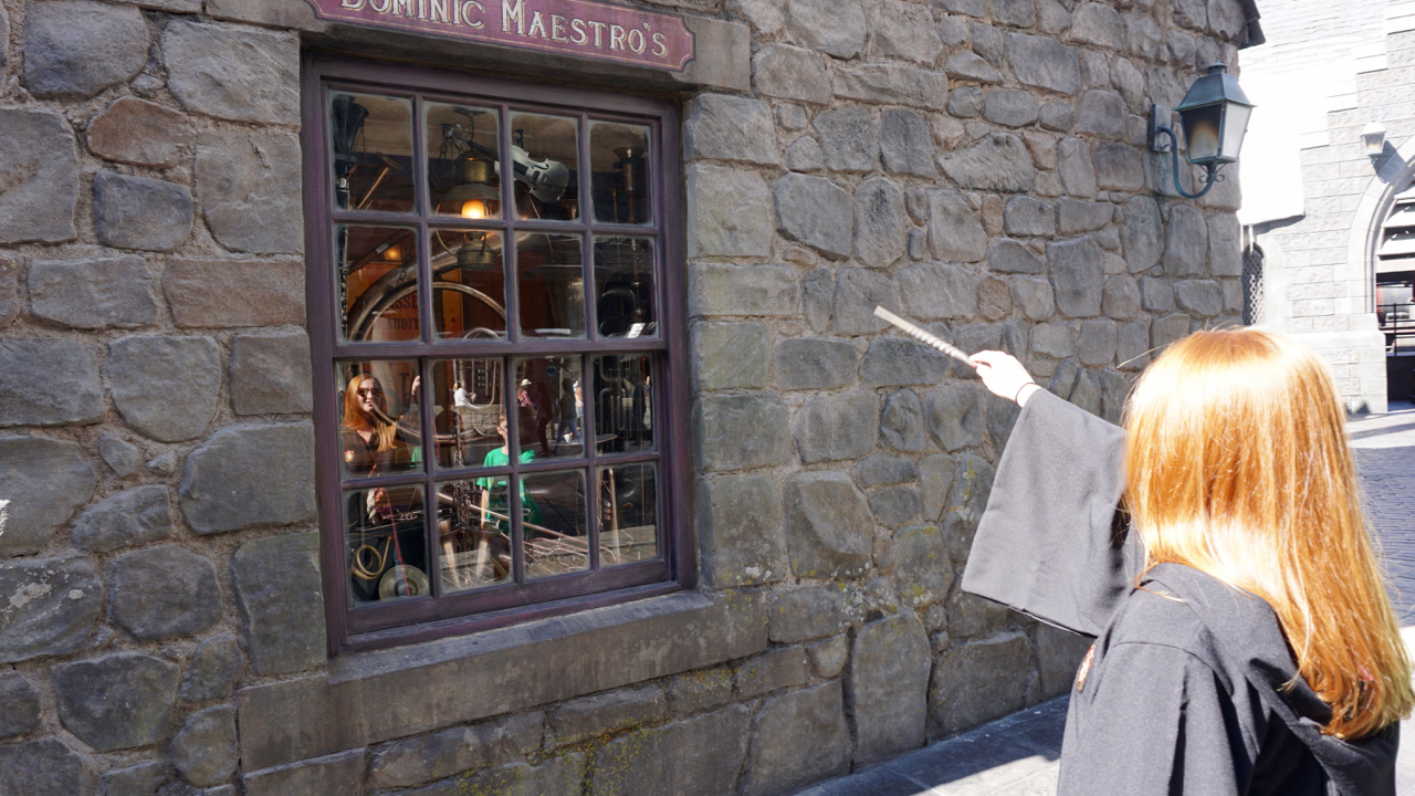 Testing out my new wand before I board the Hogwarts Express. All of the wands at Ollivanders can be purchased as “interactive” wands. The interactive wands have a tiny sensor on the end (like your TV remote) that can interact with the displays in the shop windows throughout the park.