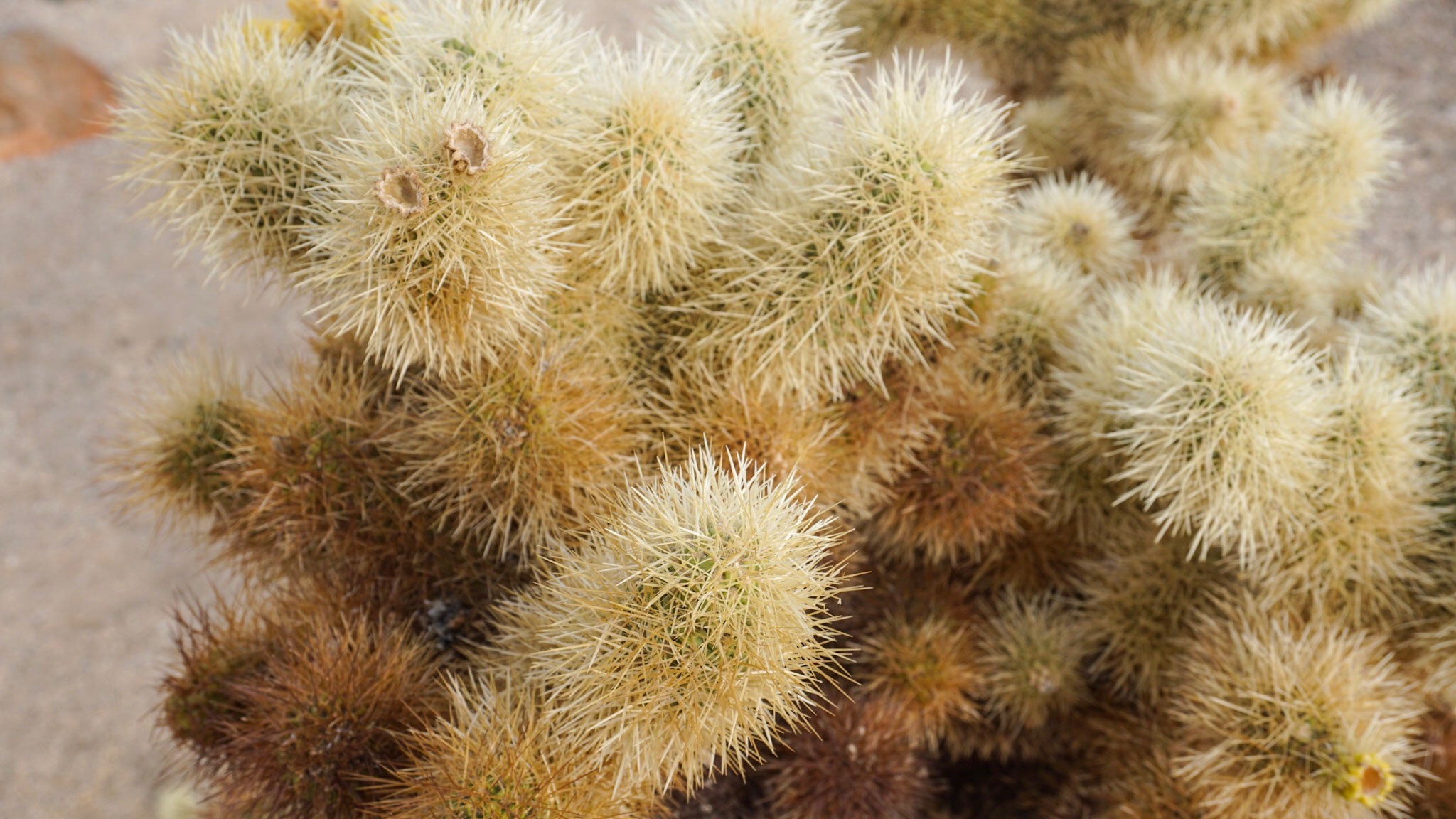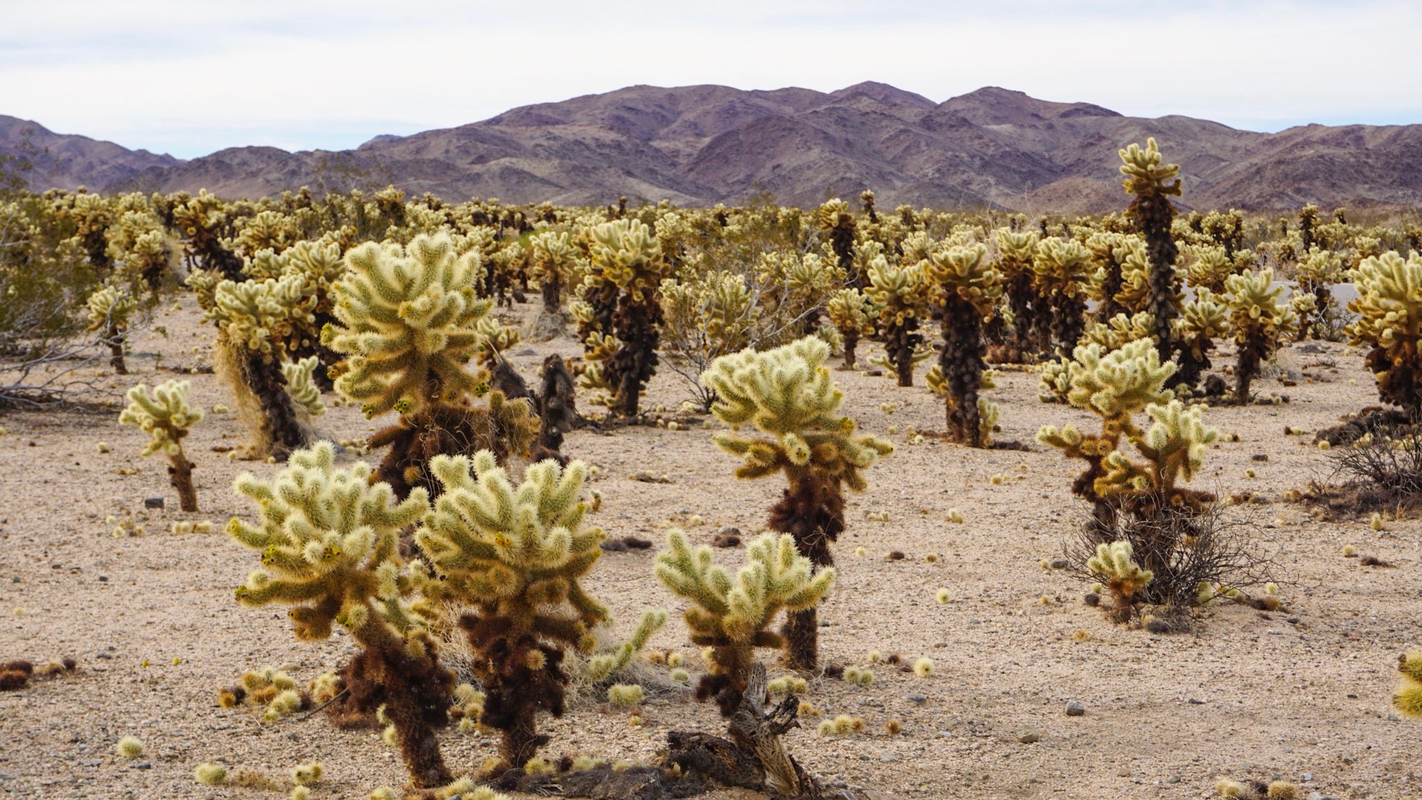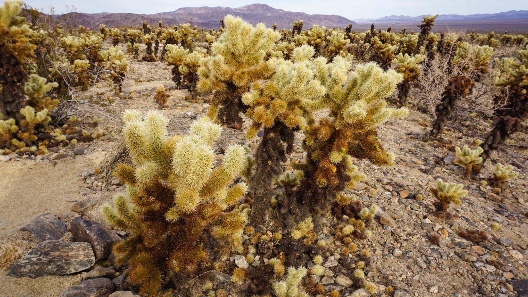 The dark, dried up lower half of each plant makes it look as if a wildfire went through the area. In reality, this is just how the Cholla grows. The bottom of the plant dries up into a woody stalk while the succulent branches continue to grow from the top.