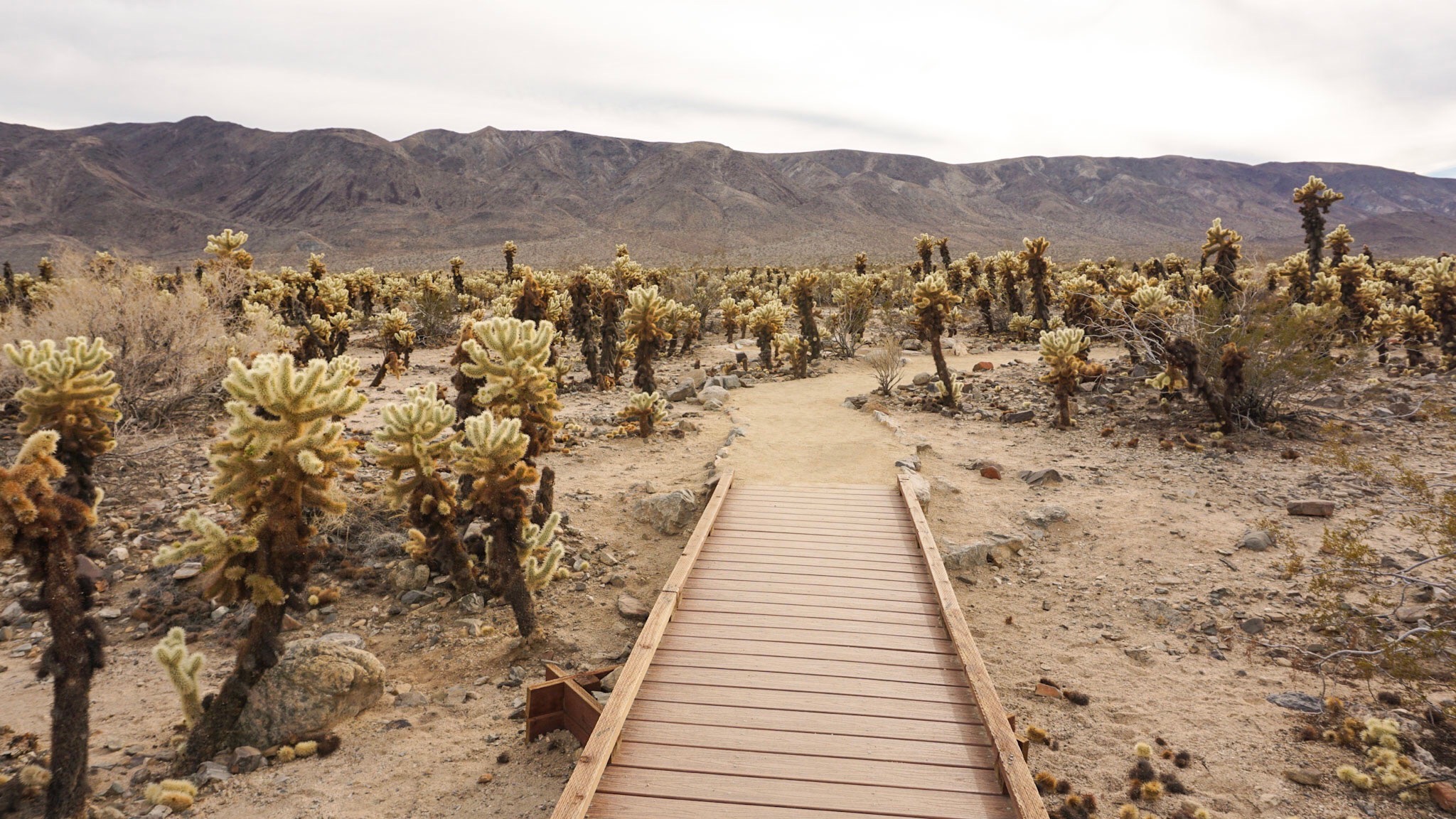 Joshua Tree is actually made up of two distinct deserts, the Mojave and Colorado. The western side of the park (and our camping spot) are part of the Mojave desert. This desert is around 3,000 feet above sea level and is where you find the giant boulder piles and Joshua Trees that made this park famous. The lower elevations found in the eastern Colorado desert are home to a strange plant called the Cholla Cactus. We didn’t venture very far into the eastern side of the park, but did drive far enough to see the Cholla Garden, a dense field of the prickly cacti.