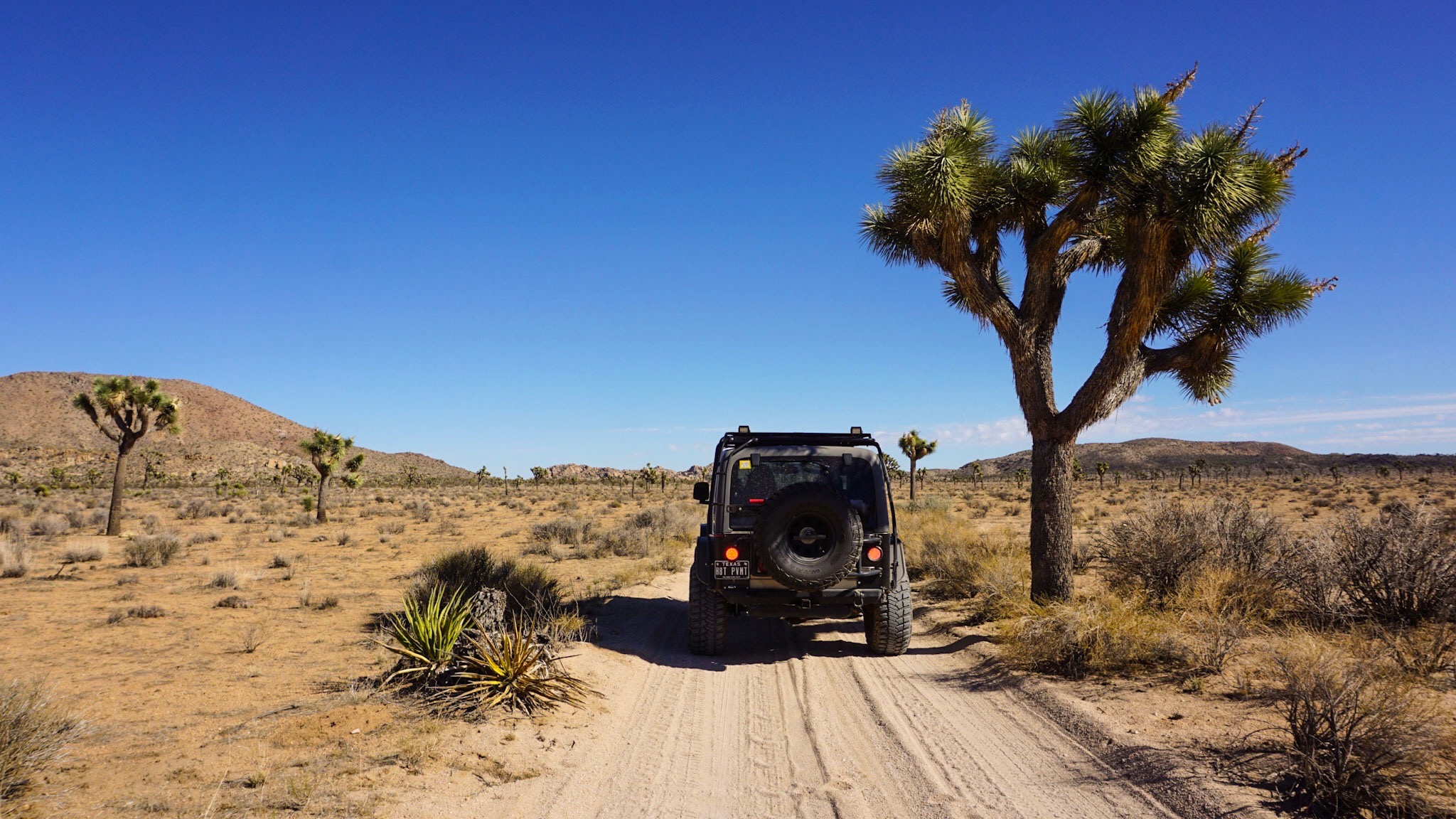 This area of BLM land is often referred to as North Joshua Tree BLM or the Joshua Tree Lakebed. I also found one website that called it Coyote Lake. Essentially, this is a huge dry lakebed that is completely open for RV camping, tent camping, off-roading, hiking, etc. There is no gate, no fees, no designated campsites, and no utilities. We parked the RV on the main road and used the Jeep to check out the area and find a place to park the rig. The last thing we wanted was to get our giant motor home stuck in the sand. Luckily, the ground was very dry and well compacted so we had no troubles driving the RV out onto the lakebed. This might be a tricky spot to camp during a rain storm as I suspect it all turns to mud very quickly. We saw evidence of lots of people having been stuck.