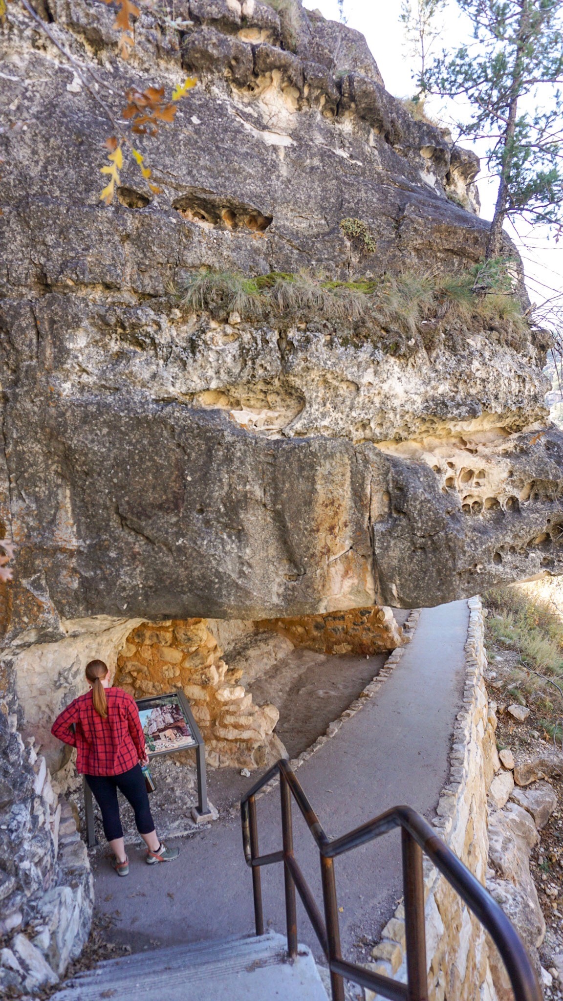 We walked the Island Trail, which is only a mile long but climbs down and back up 185-feet (240 steps) to the visitor center. If that sounds like too many steps for you, I encourage you to give it a try anyway. There are lots of benches to stop and rest along the way and the tour was very interesting. Once you’ve climbed down all 240 of those steps the path takes you past 25 different rooms built into the cliff.
