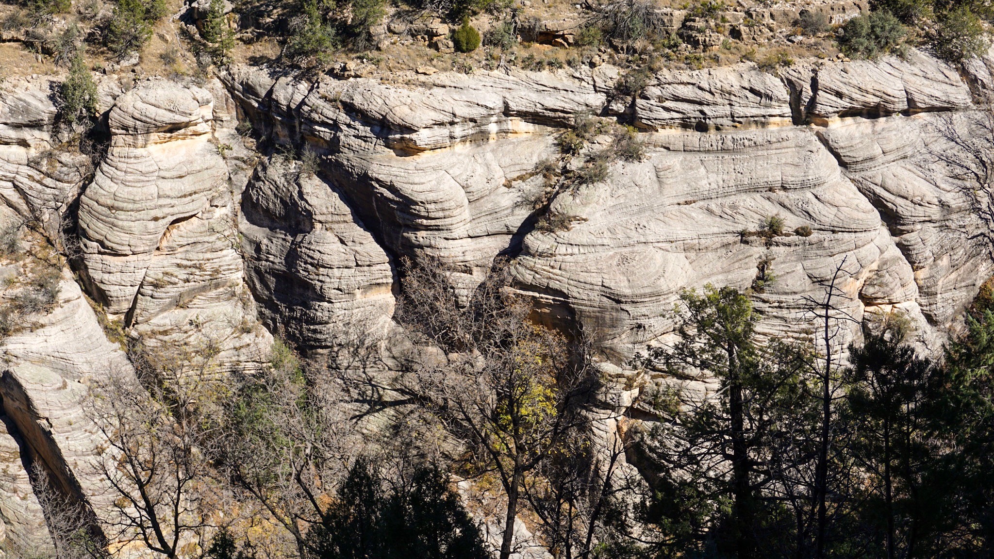 If you look very closely you can see a bead of silicone drawn along the rock face. The park staff uses lines of silicone to divert water running over the edge of the cliff, preventing further erosion and damage to the dwellings. Unfortunatly, most of the damage to the dwellings was done by people (not nature) during the 19th century. These ruins suffered from archeological tourism and souvenir hunting, much like Casa Grande in southern Arizona. In some areas the early tourists actually blasted the cliffs with dynamite to remove the exterior walls of the dwelling to provide more light by which to scavenge for ancient pottery and jewelry.
