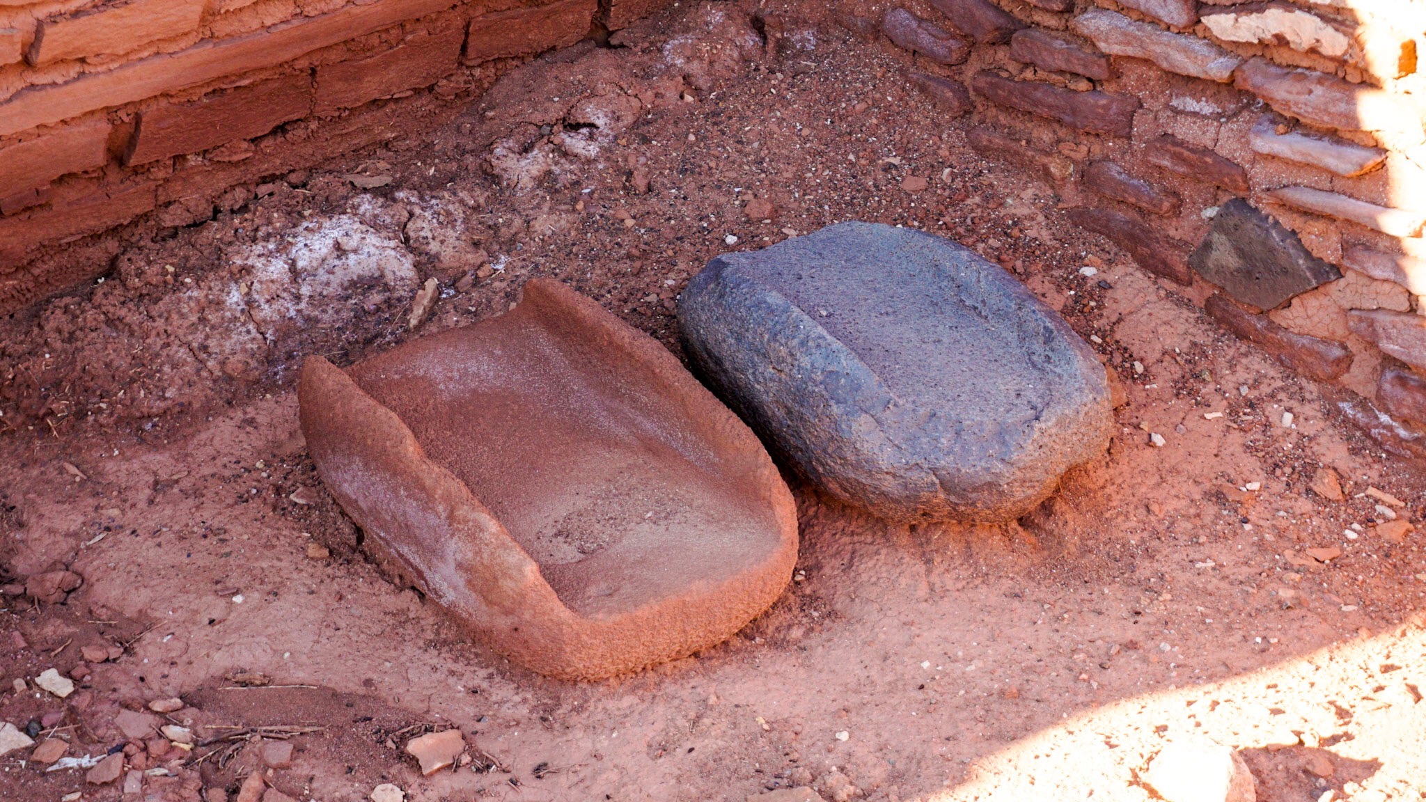 These flattened stones were used to grind corn and other grains into flour for bread.