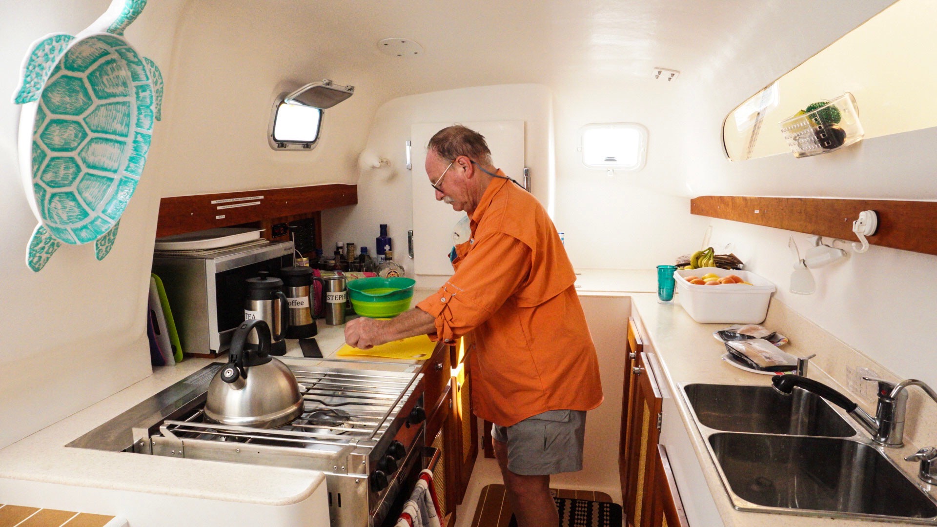 My dad was in the galley doing what he does best! We had so many amazing meals on this trip that it’s hard to remember what we ate when, but I believe he was prepping blackened snapper for lunch. One of the big benefits of a catamaran over a monohull sailboat is the ability to easily cook while underway. Unlike monohulls, catamarans don’t heel (i.e., lean over while under sail). This means that you can put a pot on the stove or chop veggies on the counter and everything stays put!